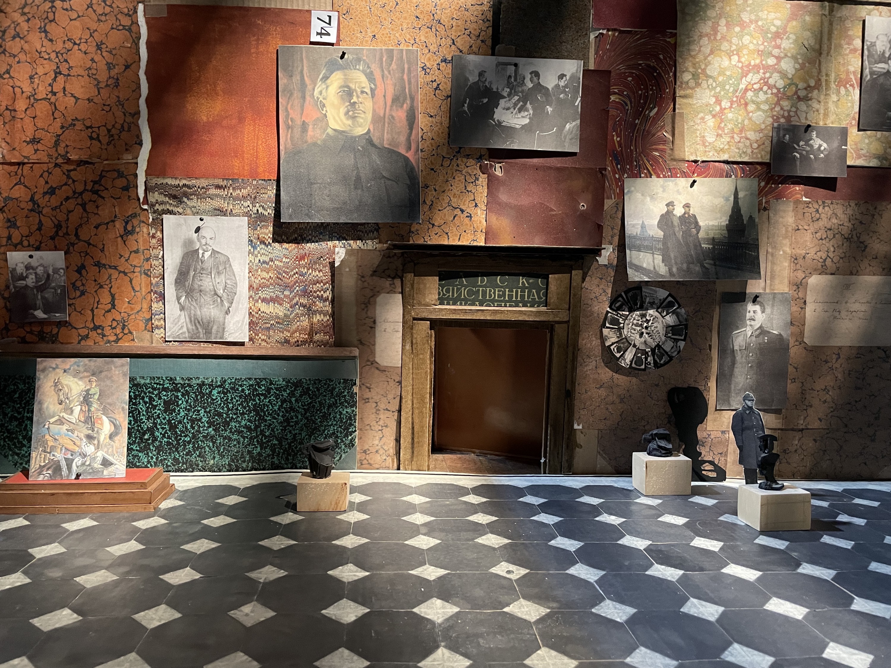 The central characters of the film are Lenin, Trotsky and Stalin; Shostakovich and his student Elmira Nazirova (about which there are different theories regarding her relationship with Shostakovich and the 10th Symphony and whether her name is embedded into some of the key signatures of the symphony); Mayakovsky and his lover Lily Brik. These characters appear as puppets, but are also performed by actors inside of puppets. The form is one of collage, and the larger proposition is that one needs to understand history as a form of collage. The artistic medium is a way of thinking about the historical events.